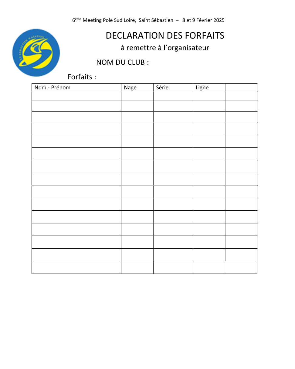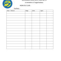Une fiche préparatoire vous sera distribuée afin de centraliser les forfaits. Merci aux entraineurs de ramener cette fiche dès que possible pour effectuer les corrections sur les programmes organisateurs (chambre d’appel/starter/juge arbitre/saisie live)
