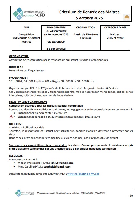 Le planning se trouve sur le Live de la compétition Critérium de Rentrée 1ère Journée 25M La Madeleine